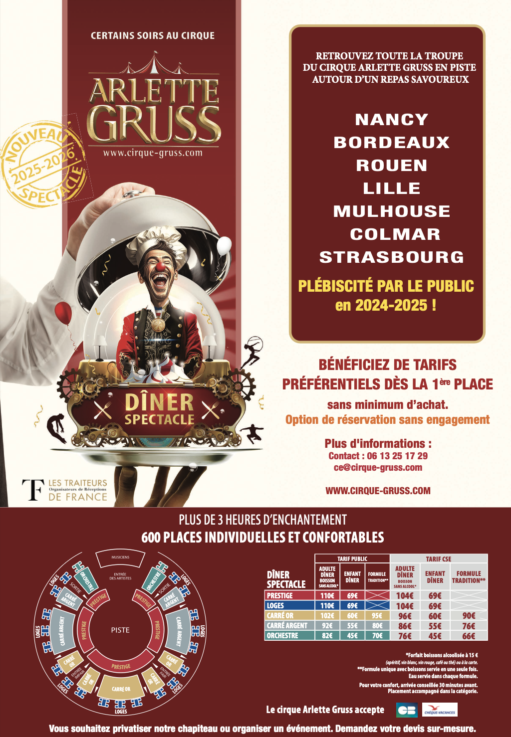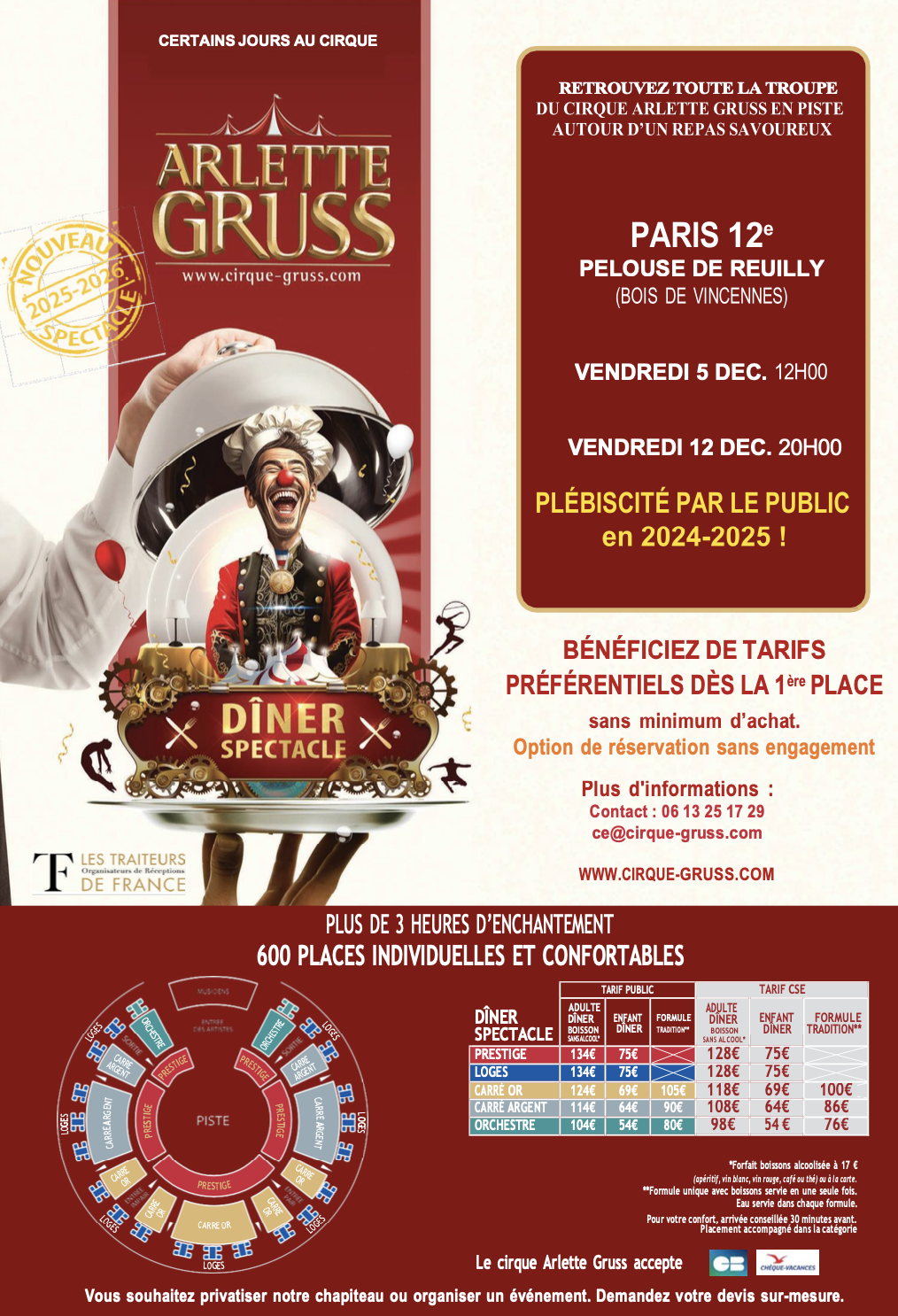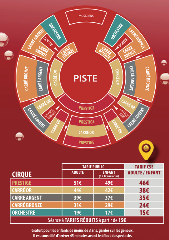 Rapprochez-vous de votre CSE afin de bénéficier des tarifs préférentiels (sous réserve que le CSE ait contracté un partenariat avec le Cirque Arlette Grus). Si ce n’est pas le cas, invitez votre CSE à contacter le service CSE Arlette Gruss (ce@cirque-gruss.com - 06 78 05 89 49)